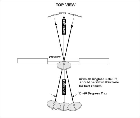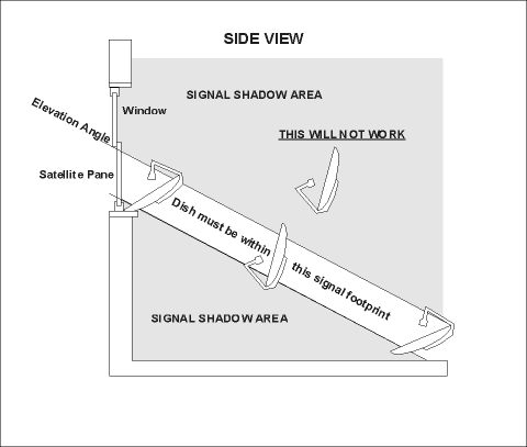 Please read this page carefully, and be sure that you have a window that will work before you buy. Purchase price is non-refundable. These plans can be built using normal hand tools such as jigsaw, tape measure, calipers, etc. If you are comfortable with using these items, you will have no problem building and installing the satellite pane. The existing pane is replaced in the sash as you would do if it were broken. The design assumes that you have a window that is facing directly at the satellite, or "on boresight". If the satellite is 10-20 degrees off of boresight in azimuth, it won't be much of a problem. See the "TOP VIEW" Diagram below. If you start to get up into the 30-50 degree area, the window's apparent width becomes narrower, and the frame and walls will probably place much of the dish in "signal shadow" anyway, so we don't recommend using a window that faces away from the satellite this much. The best thing do if in doubt, is to temporarily set up the dish where you want to put it, with the window open. Please read about the signal "footprint" in the section below before doing this. If you get acceptable signal, you can build the satellite pane and assume it will attenuate the signal little, if any. We recommend mounting the dish on the sill, inverted to save space, as in the photo on the Home page. You will probably get the best signal there. The photo is of an actual working installation. If you choose this orientation, you will have to fabricate a different mount. Remember though, wherever you mount it, you must project the azimuth and elevation look angles through the window and locate the dish within this "signal footprint". The further away from the window the dish is, the lower, and more to the side (if your azimuth angle is not "boresight) it has to be.